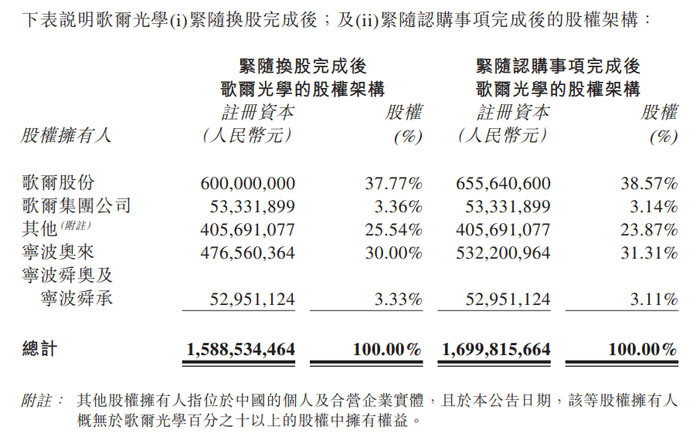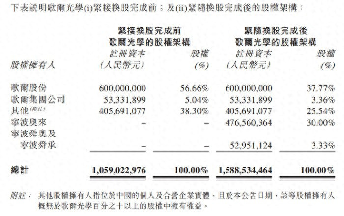换股完成后,歌尔光学注册资本增至 1,588,534,464 元人民币,股权结构调整为:歌尔股份持股比例降至 37.77%(注册资本保持 6 亿元人民币),歌尔集团公司持股 3.36%(注册资本不变),其他股东持股 25.54%;宁波奥来、宁波舜奥及宁波舜承通过换股方式新增持股,其中宁波奥来持有 30.00% 股权(对应注册资本 476,560,364 元人民币),宁波舜奥及宁波舜承合计持有 3.33% 股权(对应注册资本 52,951,124 元人民币)。